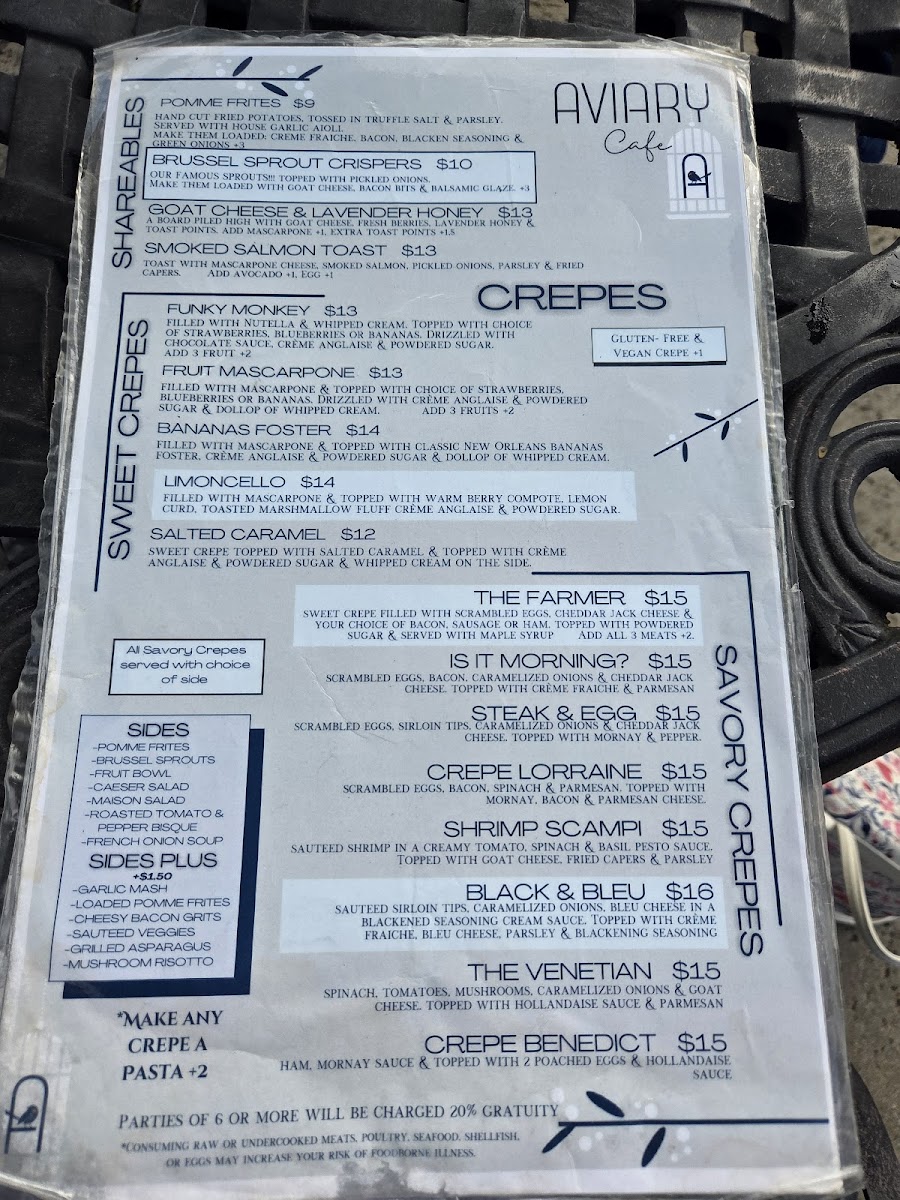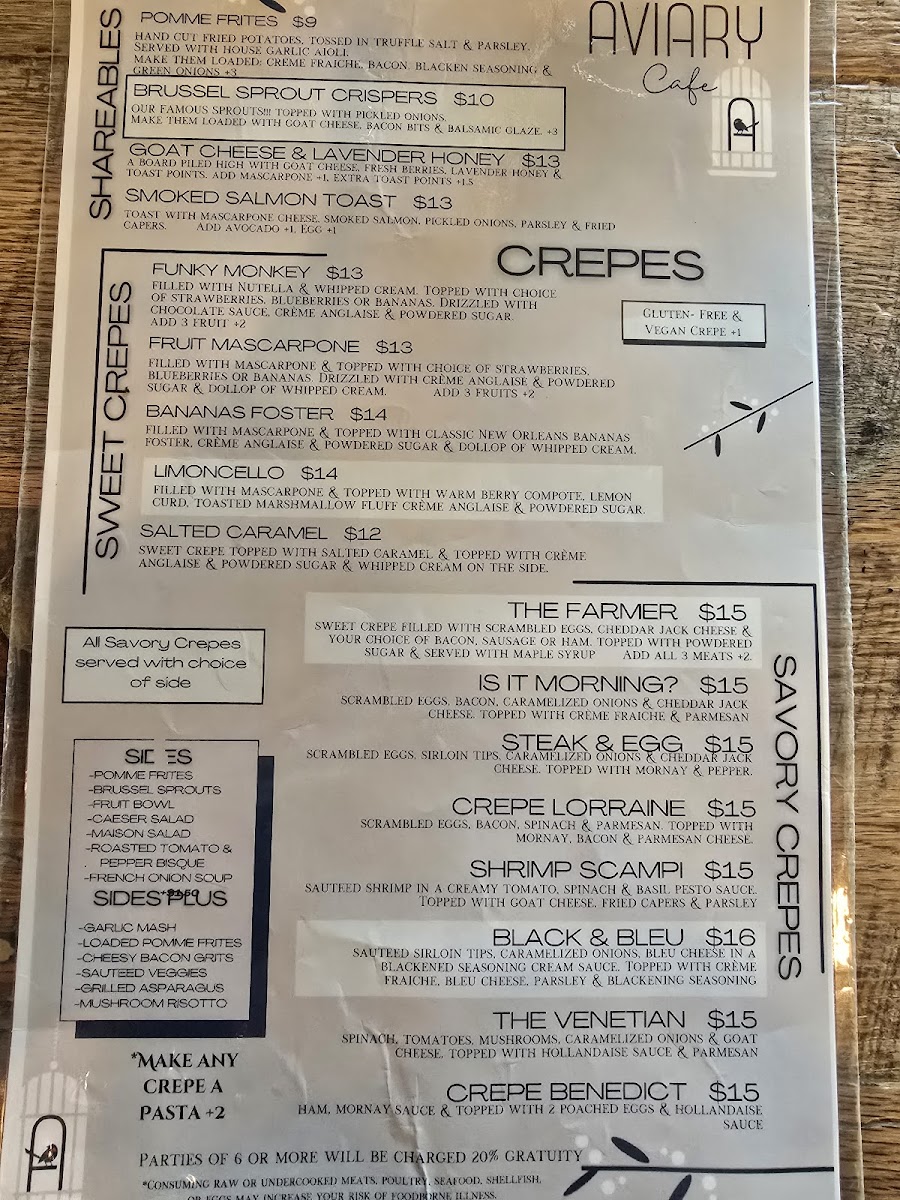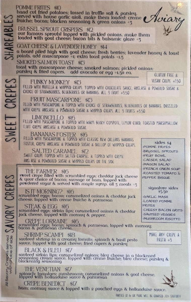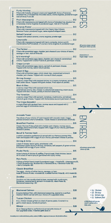 A sweet crepe filled with mascarpone, topped with classic New Orleans Bananas Foster, creme anglaise, powdered sugar & a dollop of whipped cream.